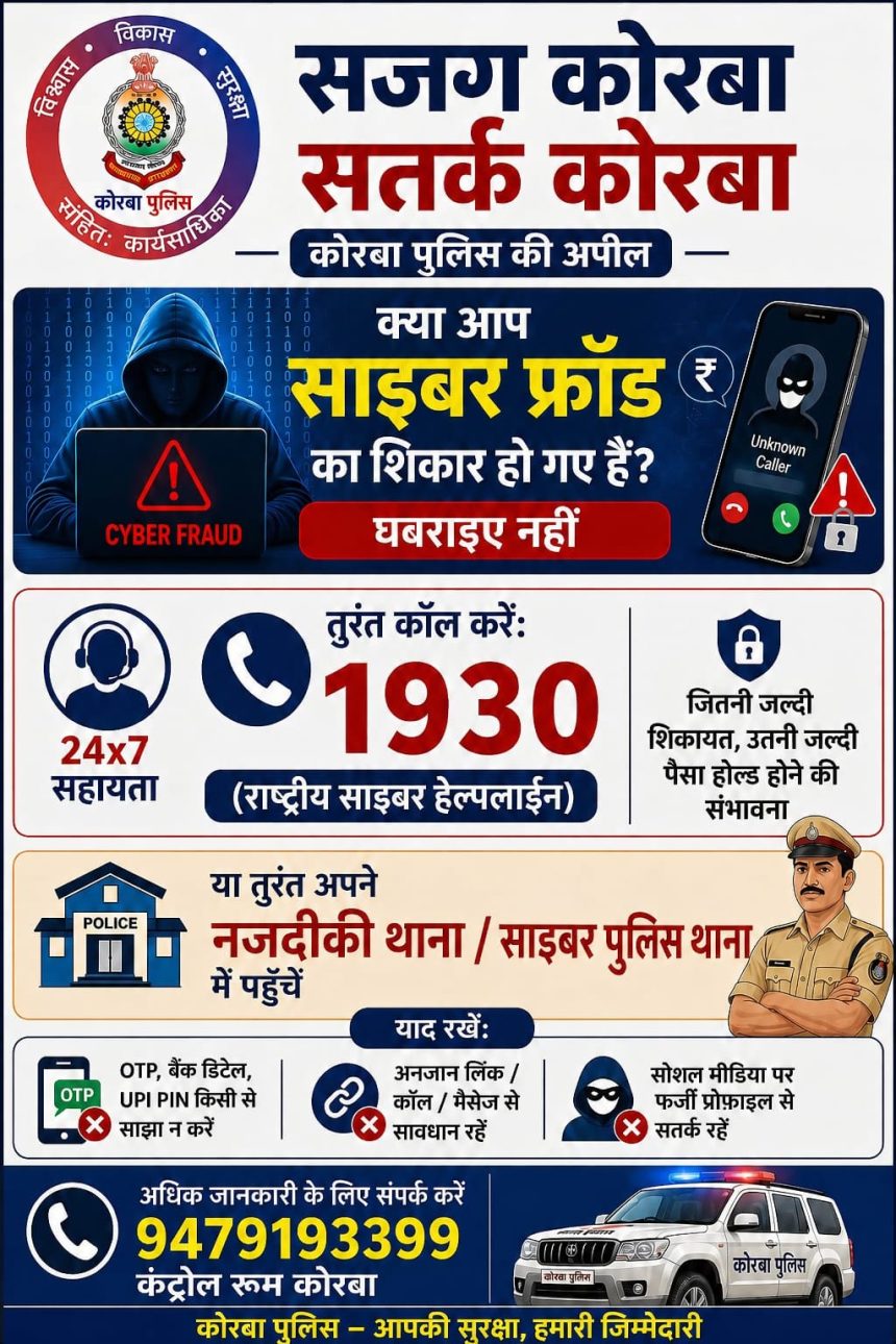 पुलिस ने यह भी चेतावनी दी है कि लोग किसी भी अनजान कॉल, लिंक या मैसेज से सतर्क रहें और अपना OTP, बैंक डिटेल या UPI PIN किसी के साथ साझा न करें। अधिक जानकारी के लिए कंट्रोल रूम के नंबर 9479193399 पर संपर्क किया जा सकता है। कोरबा पुलिस ने स्पष्ट किया है कि साइबर अपराधों के खिलाफ सख्त कार्रवाई और जागरूकता अभियान आगे भी जारी रहेगा, ताकि जिले में सुरक्षित माहौल बनाए रखा जा सके।