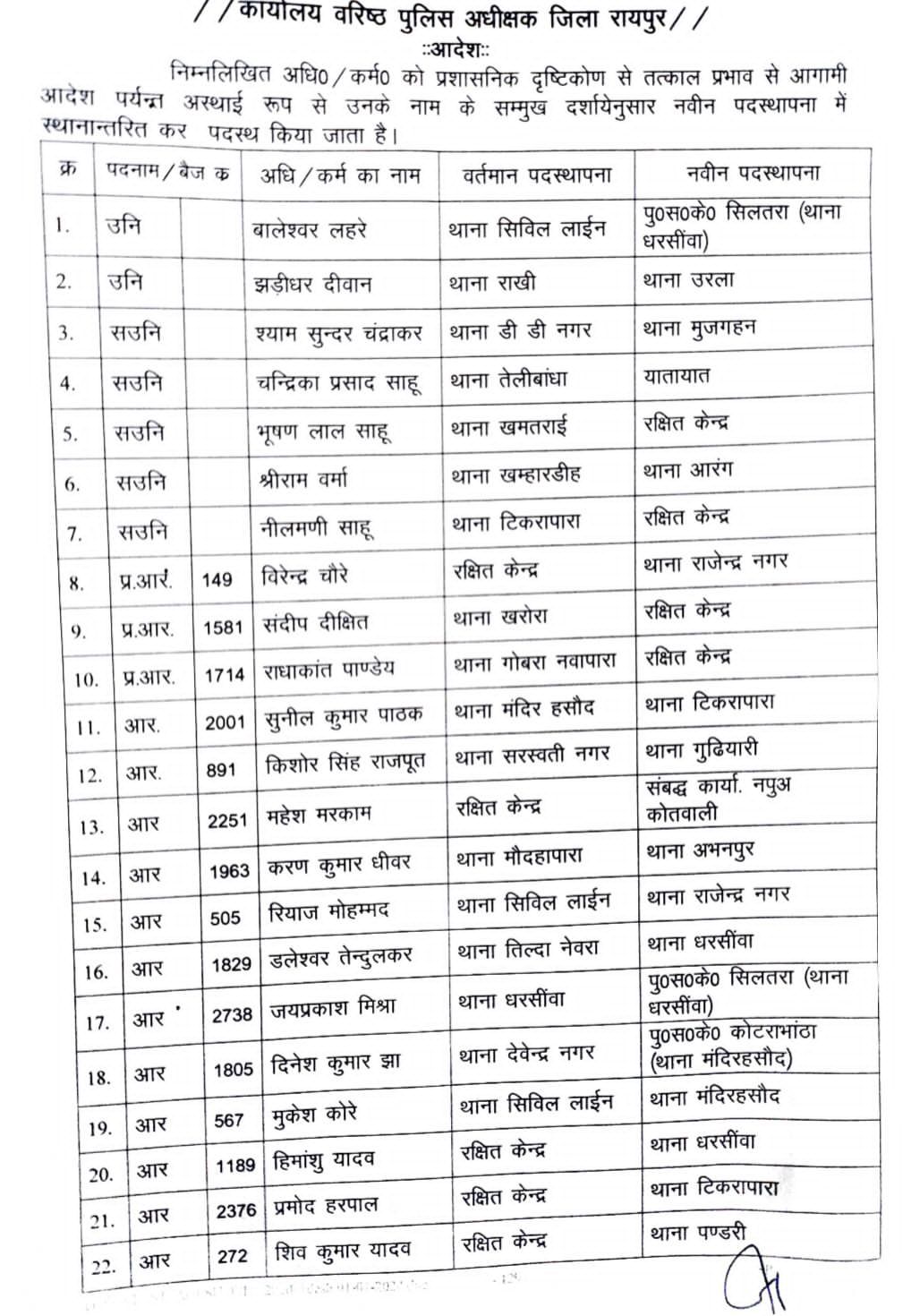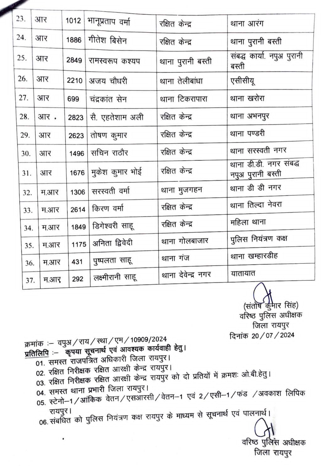 रायपुर/सीजी एनएन 24 न्यूज: रायपुर पुलिस विभाग में एक बार फिर से बड़ा तबादला हुआ है। SI, ASI, हेड कांस्टेबल समेत 37 पुलिसकर्मियों को इधर से उधर किया गया है। यह आदेश देर रात वरिष्ठ पुलिस अधीक्षक संतोष कुमार सिंह ने जारी किया है।