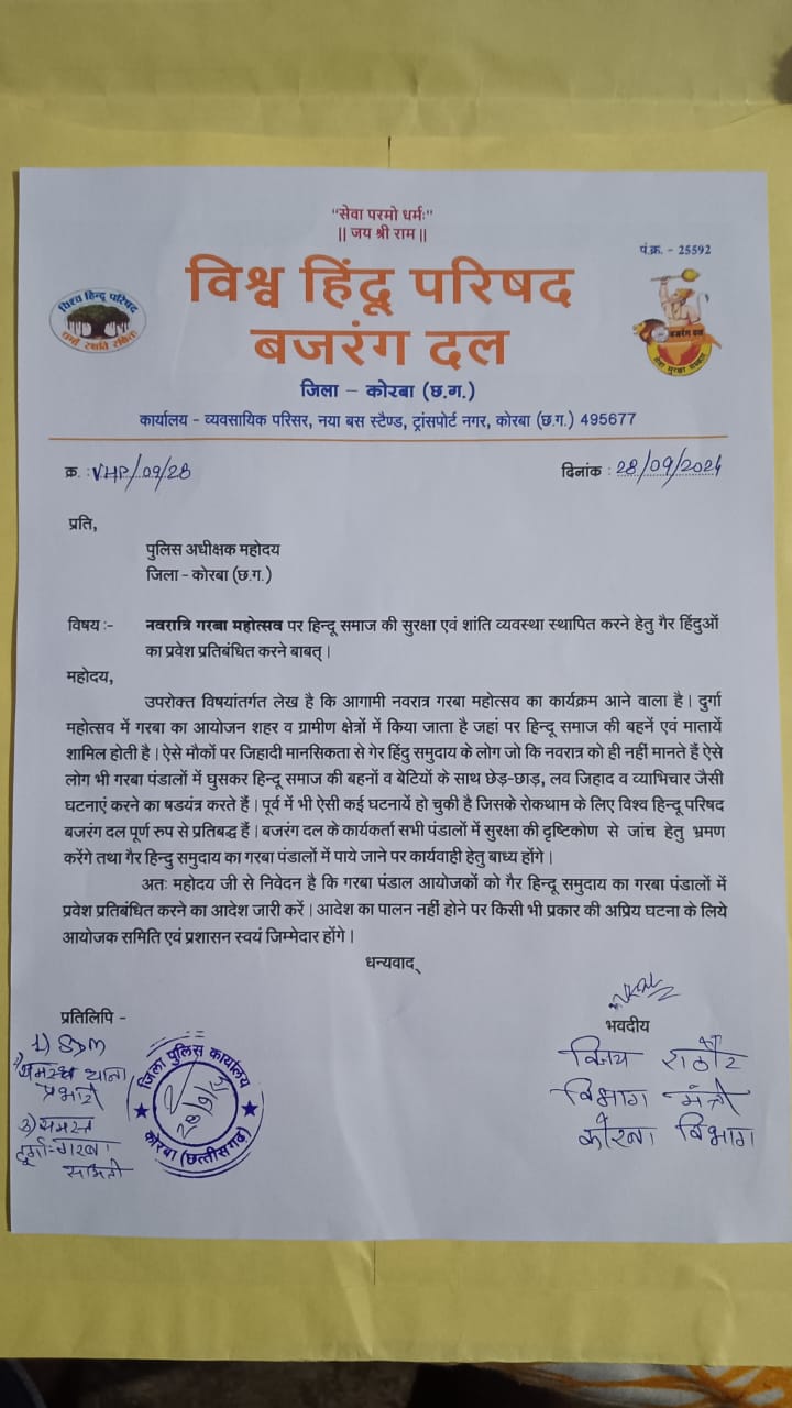 नवरात्रि गरबा महोत्सव में गैर हिंदुओं के प्रवेश पर प्रतिबंध और शांति व्यवस्था हेतु बजरंग दल ने पुलिस अधीक्षक को ज्ञापन सौंपा